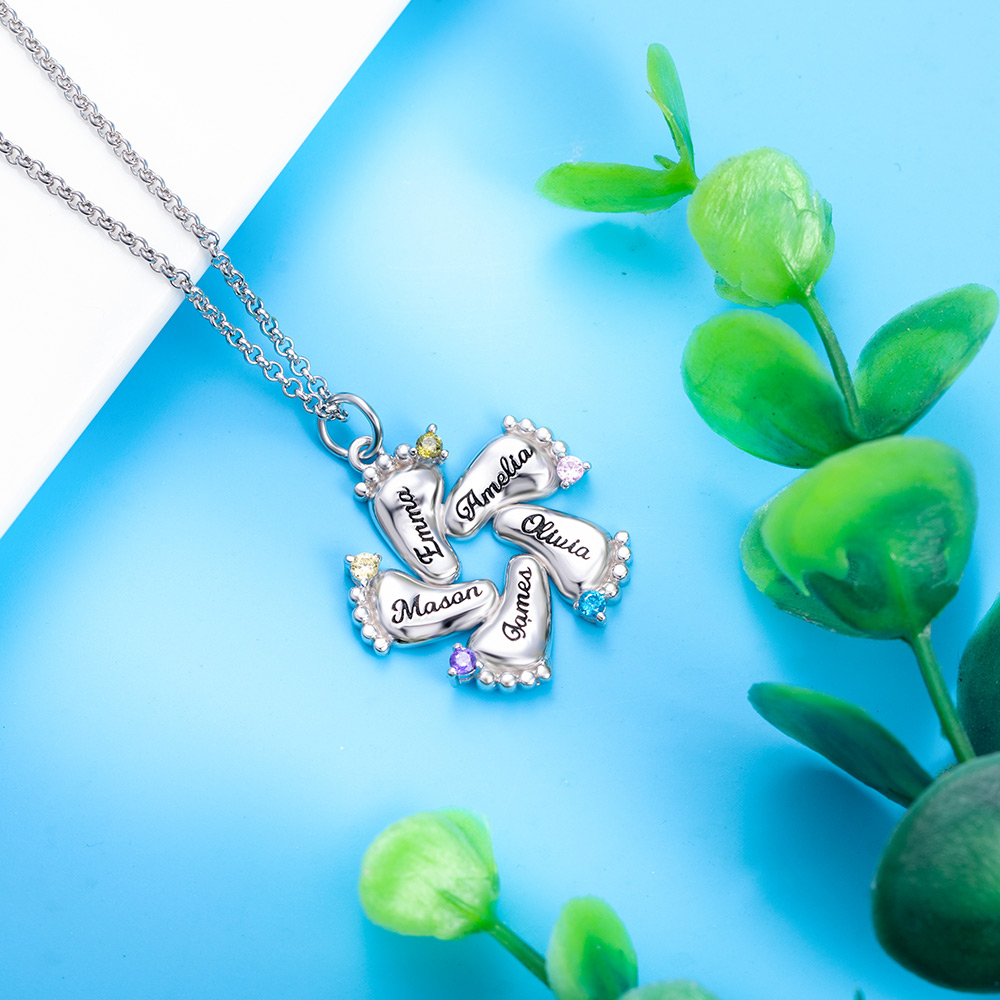 L'amore di una madre è così puro: una madre non può mai trattare un bambino meglio dell'altro perché l'amore che porta per ciascuno dei suoi figli non può mai essere spiegato. La nostra collana in argento personalizzata con piedini e pietre portafortuna presenta simpatici piedini da bambino con una pietra portafortuna attaccata a ciascuno di essi.