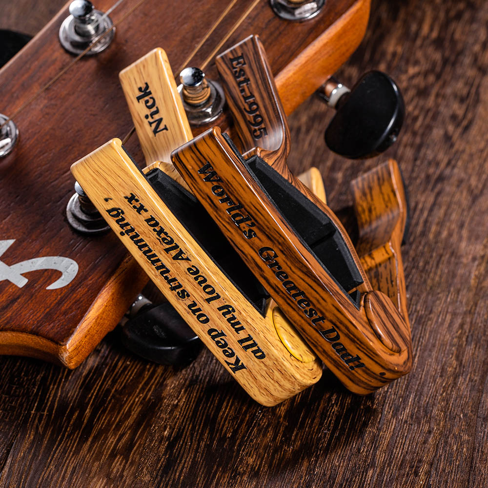 Un Capo chitarra personalizzato è il miglior regalo per gli amanti della chitarra. Realizzato in metallo, il capo chitarra è dipinto che mostrare una speciale struttura in legno ed è abbastanza resistente per molti anni Il nome può essere inciso sul Capo chitarra rendendo la chitarra più attraente. Lo regali a te stesso o ai tuoi amici amanti della chitarra!
