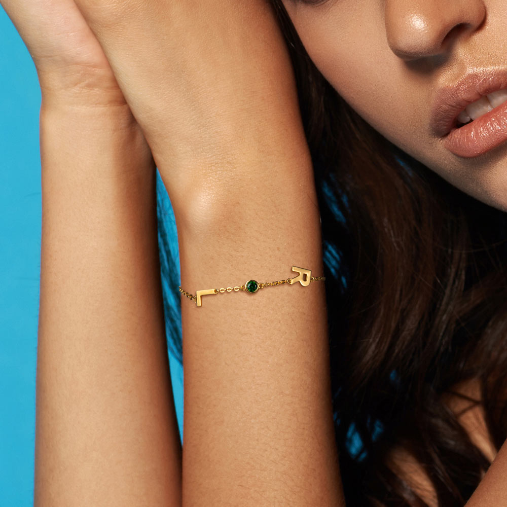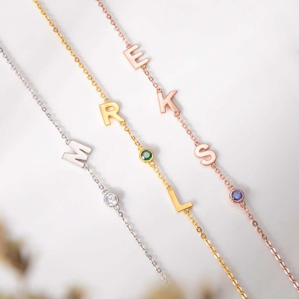 Braccialetto delicato per una visione quotidiana! La catena collega al massimo 6 iniziali e 1 pietra natale tutte realizzate per le tue esigenze personalizzate. Per renderlo un bellissimo regalo per amici o per sé, personalizzalo con il nome di chi lo indossa o parole speciali. Si noti che di solito metteremo la pietra natale nel mezzo delle iniziali se il numero selezionato di iniziali è due.
